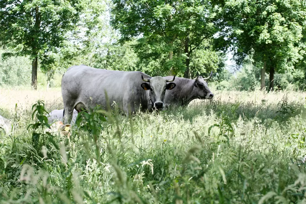In 2011 hebben wij als eerste ter wereld een goed doorlichte ‘koeientuin’ gebouwd, waar de runderen heerlijk in de beschutting van inpandige bomen kunnen staan met voldoende frisse lucht, daglicht en uitloop naar buiten, zoals het hoort. In een weiland ligt een koe het liefst onder een boom, daarom staan er bomen in de stal. Het is een open stal, zodat er veel lucht en licht is; het dak is van lichtdoorlatend materiaal. Ook de wanden zijn grotendeels open. Onze Gasconne koeien en kalfjes voeren we zoveel mogelijk gras en met de kruiden die in de weide groeien. In de winter krijgen de koeien ook bietenpulp, aardappels en bierbostel. Wist je dat onze stal is uitgebreid? In de Horn heeft boer Dirco een vierde boog toegevoegd aan onze serrestal.